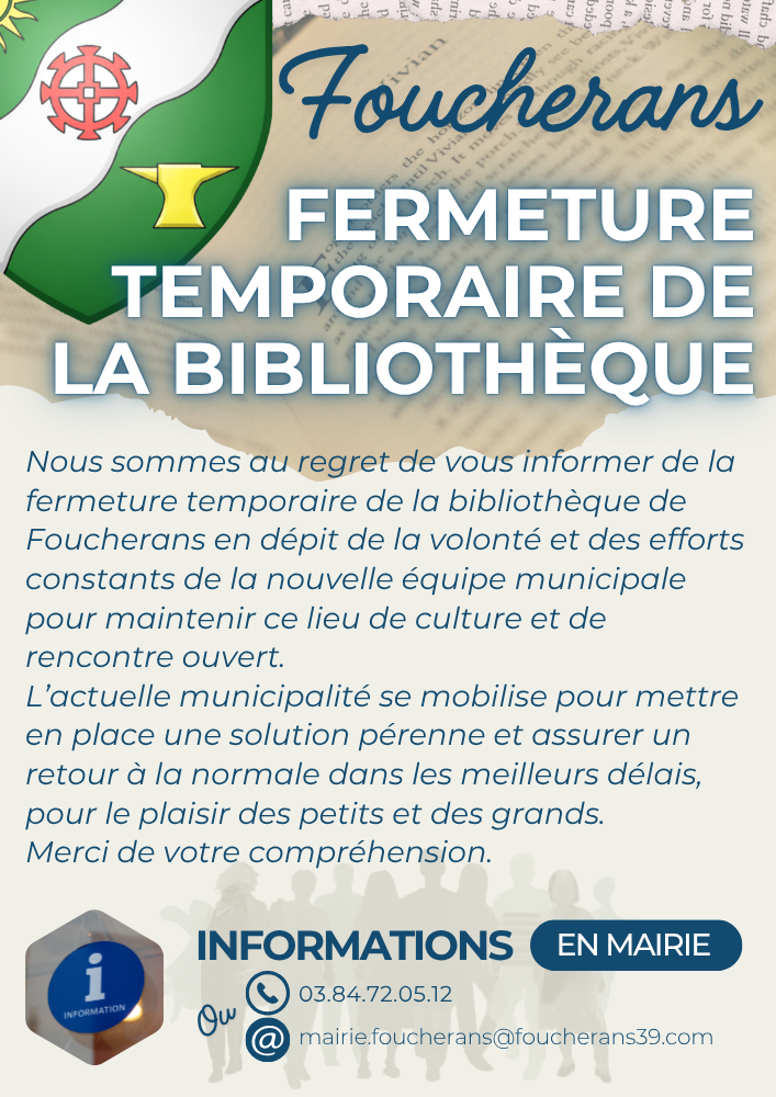 - Nous sommes au regret de vous informer de la fermeture temporaire de la bibliothèque de Foucherans en dépit de la volonté et des efforts constants de la nouvelle équipe municipale pour maintenir ce lieu de culture et de rencontre ouvert.